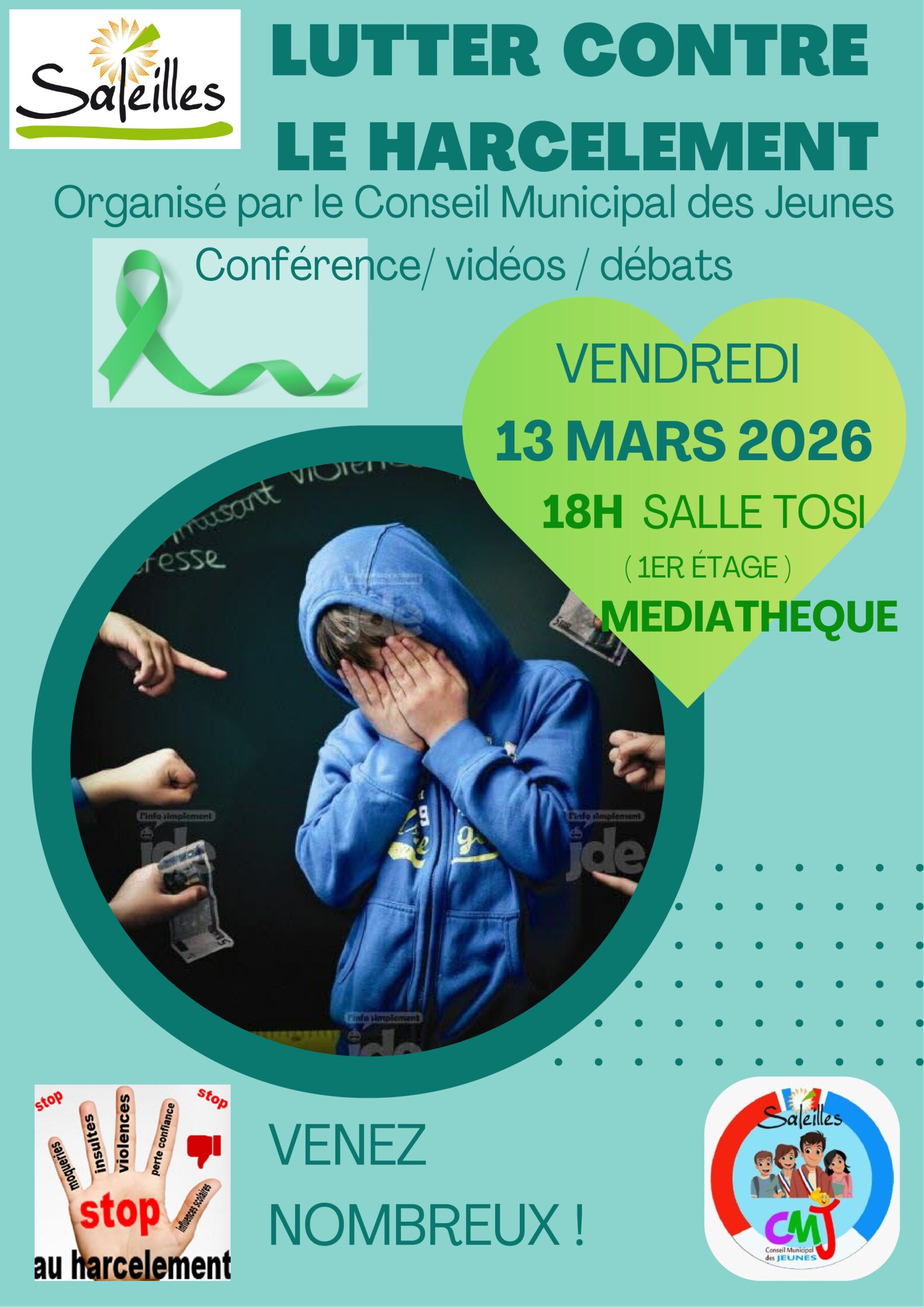 – VENDREDI 13 MARS 18 H, salle Tosi, au 1er étage de la médiathèque, se tiendra une conférence-débat sur le harcèlement organisée par le Conseil Municipal des Jeunes.